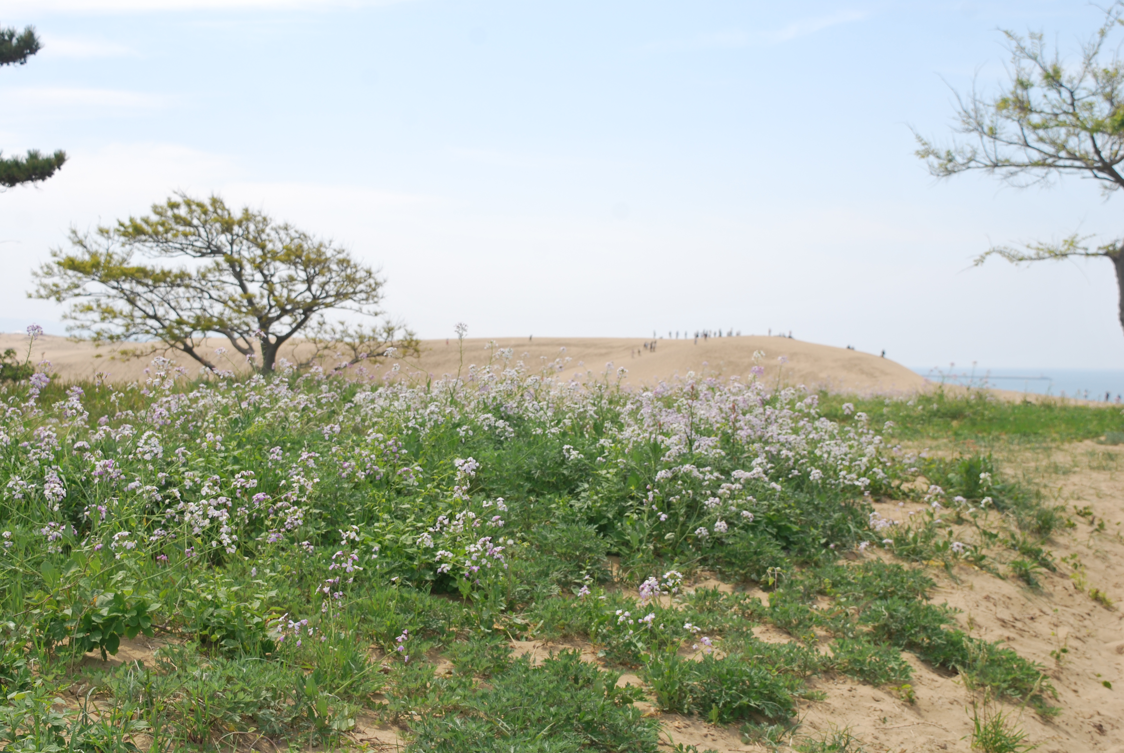 砂丘東側には可憐なハマダイコンの花が咲いています。