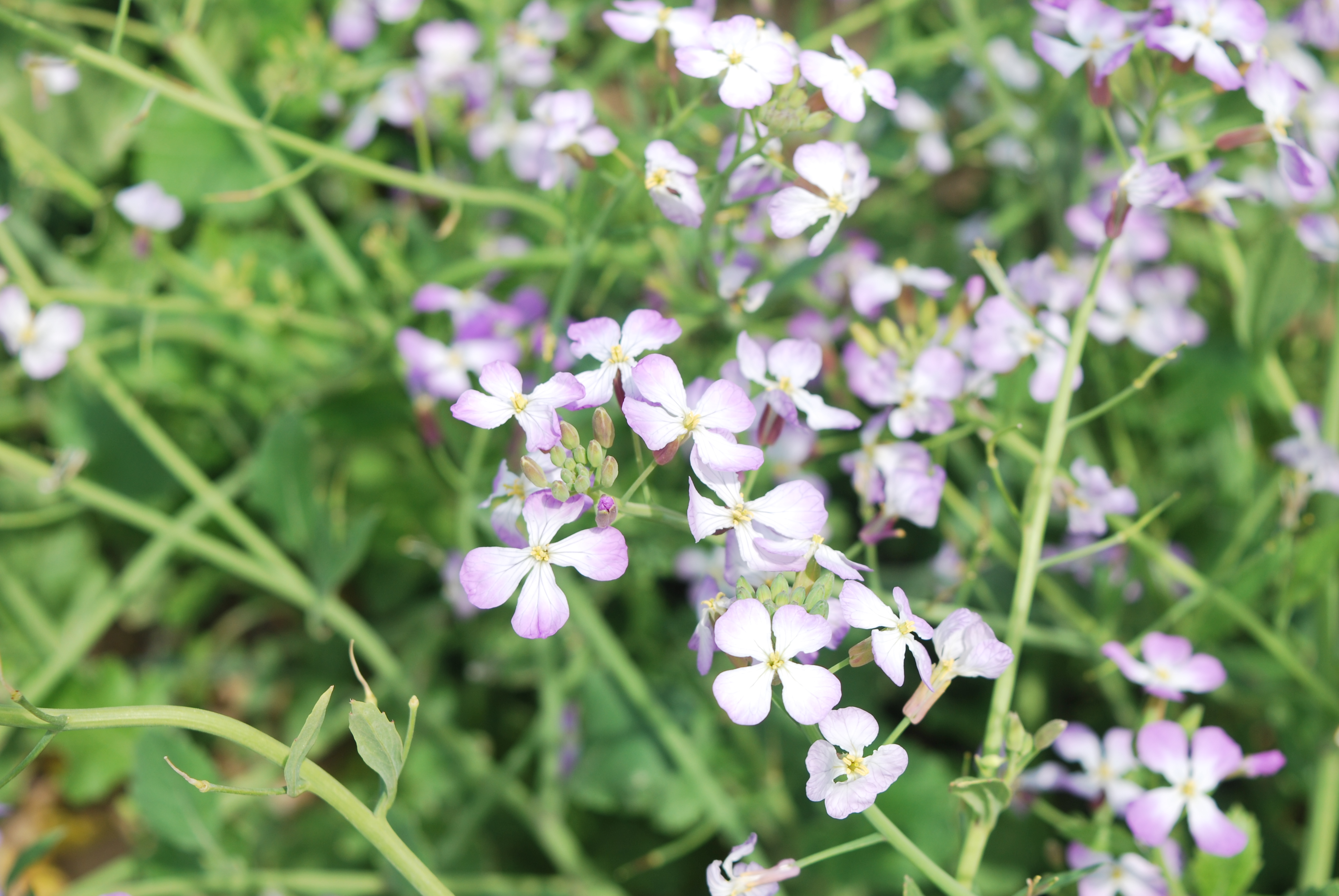 花は淡い紫色で十字の花が咲きますが、まれに白い花も咲きます。
